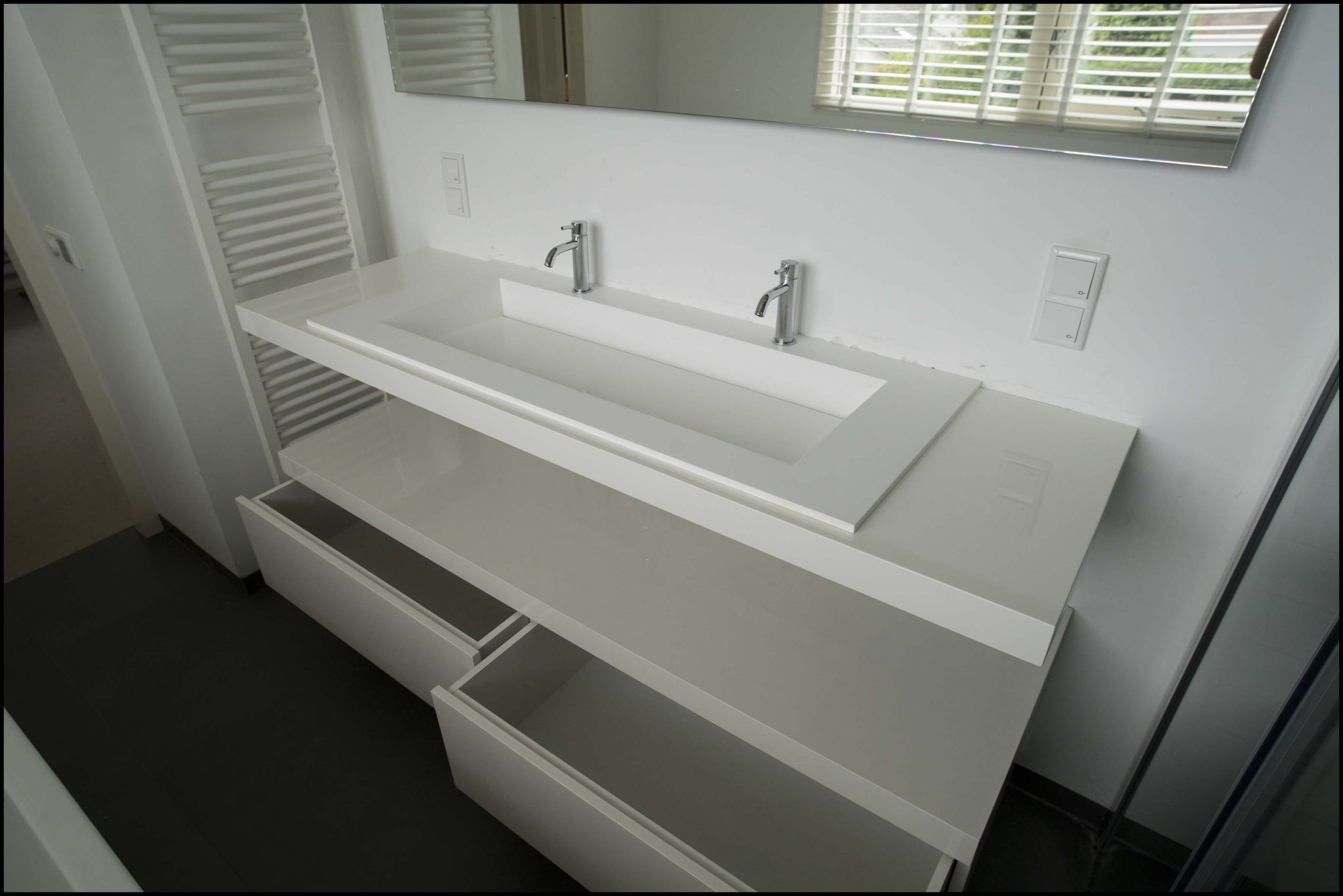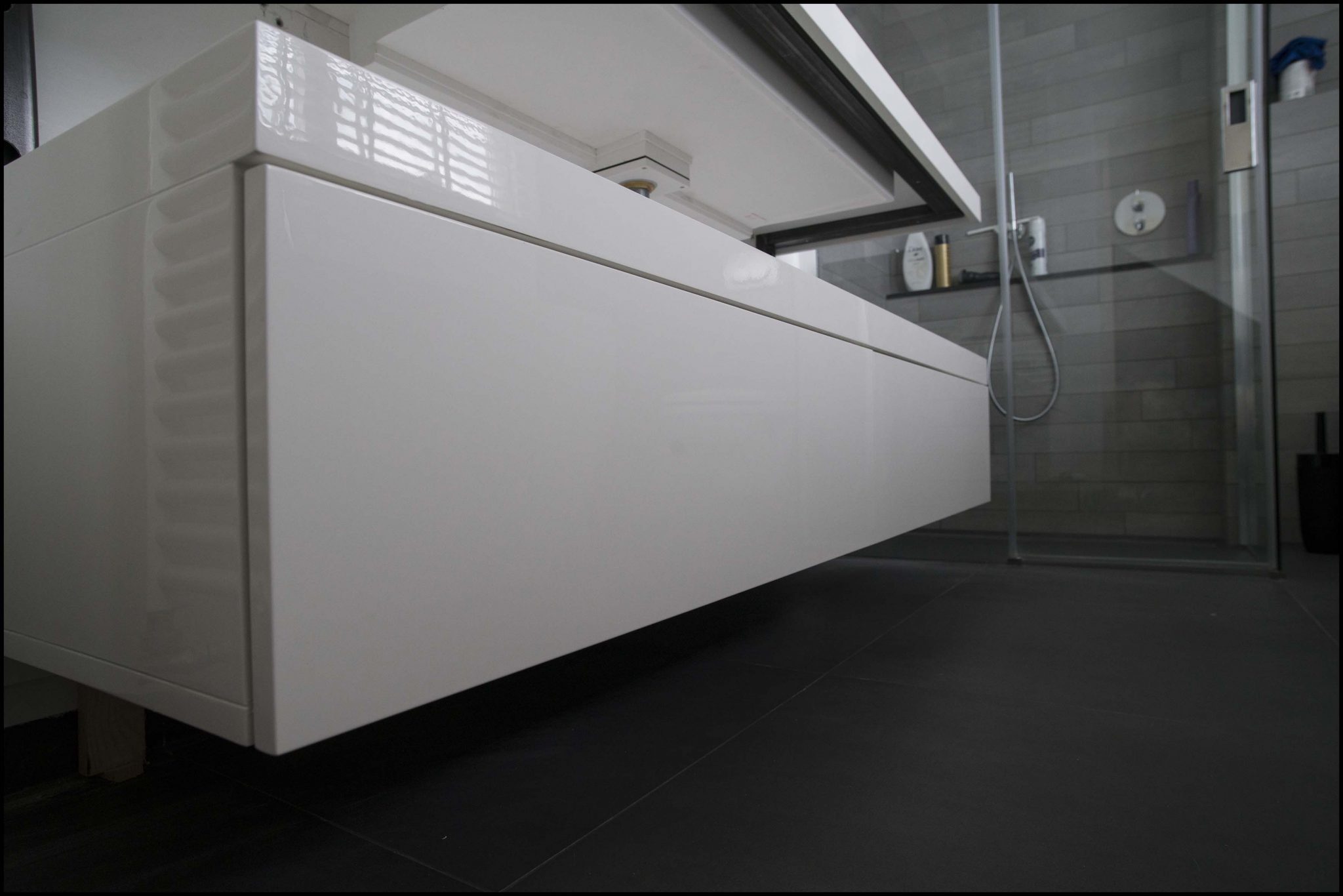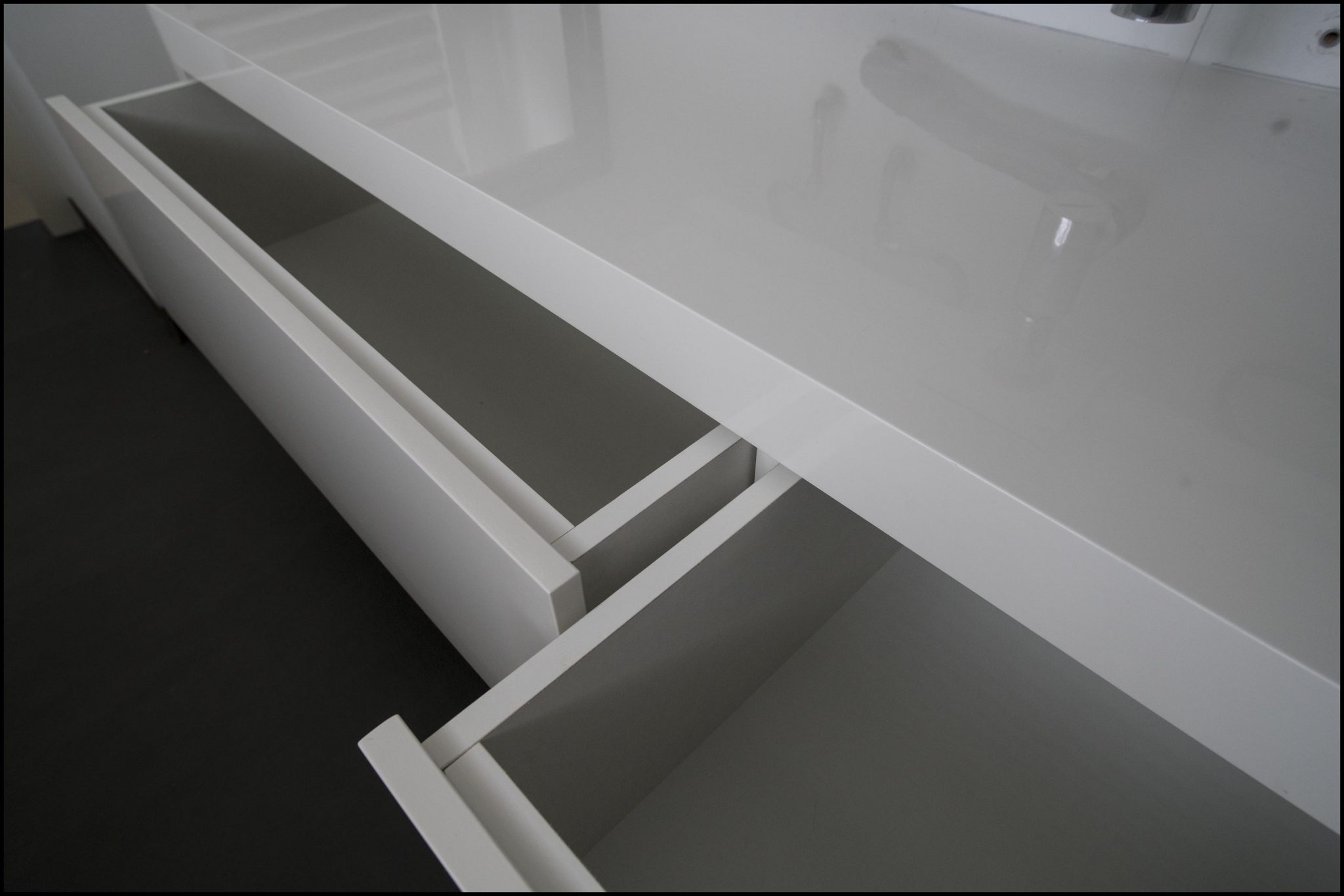 Badkamermeubel zwevend, hoogglans wit gespoten, onderkast met twee volledig uittrekbare lades.